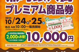 日時:2025年10月24日(金)25日(土)10:00〜 会場:魚町銀天街一丁目(武蔵前) 魚町銀天街二丁目(INOYA横) プレミア率:20%(12,000円の商品券を10,000円で販売)