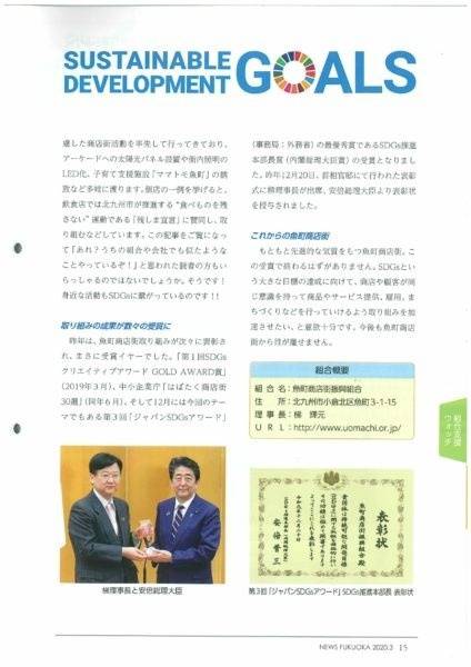 昨年は、魚町商店街の取り組みが次々に表彰され、まさに受賞イヤーでした。「第1回SDGsクリエイティブアワードGOLD AWARD賞」(2019年3月)、「はばたく商店街30選」(同年6月)、そして12月には今回のテーマもある「第3回ジャパンSDGsアワード」(事務局:外務省)の再優秀賞であるSDGs推進本部長賞(内閣総理大臣賞)の受賞となりました。昨年12月20日、首相官邸にて行われた表彰式に梯理事長が出席、安倍総理大臣より表彰状を授与されました。