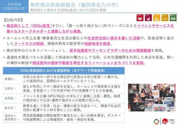 具体的には「ホームレス対策」「ママトモ魚町」「まちゼミ」「バナー再利用」「SDGs活用セミナー」「魚町銀天街SDGsPRムービー制作」等を通じてSDGsに対する参加意識の醸成や実践的な取り組みに 高い評価を頂きました。