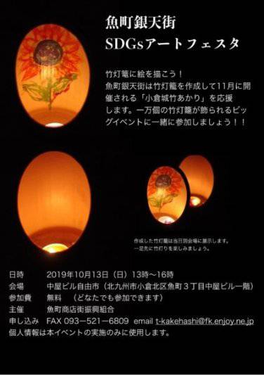 「魚町銀天街アートフェスタVol.2」開催! 2019.09.28 竹灯篭に絵を描こう! 魚町銀天街は竹灯篭を作成して11月に開催される「小倉城竹あかり」を応援します。 1万個の竹灯篭が飾られるビックイベントに一緒に参加しましょう!! 日時 2019年10月13日(日)13:00~16:00 会場 魚町三番街中屋ビル1階 三番街自由市 参加費 無料 主催 魚町商店街振興組合 申込 TEL:093-521-6801 E-mail:info@uomachi.or.jp