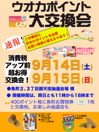 「ウオカポイント交換会」開催! 2019.09.07 日時 2019年9月14日(土)・9月15日(日)11:0~13:00 会場 魚町二・三丁目銀天街抽選会場横 400ポイント毎に魚町お買物券500円と交換他、お楽しみ抽選会も