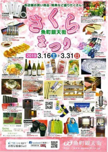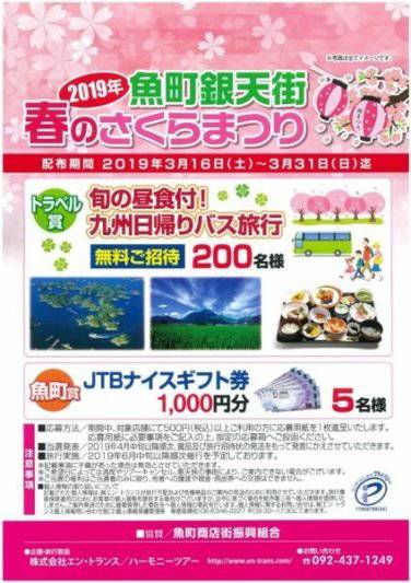 「さくらまつり」開催! 2019.03.11 魚町銀天街では、以下の日程でさくらまつりを開催します! 2019年3月16日(土)~3月31日(土) 各店舗のお買い得品・特典など盛りだくさん! 魚町銀天街でのお買い物をお楽しむください! なお、この期間中対象店舗にて500円(税込)以上をご利用の方に抽選で当たる九州日帰りバス旅行が当たる応募券を差し上げます!