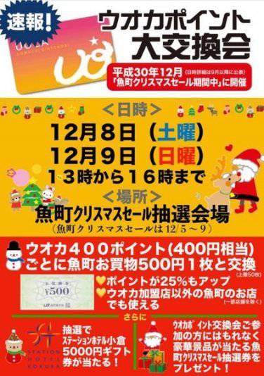 「UOCAポイント大交換会」開催! 2018.12.03 日時 2018年12月8日(土)~12月9日(日)13:00~16:00 会場 魚町銀天街クリスマスセール抽選会場(魚町三丁目) UOCAポイント400Pを魚町お買い物券500円分に交換いたします!! 参加された方にはWチャンス! 抽選でステーションホテル小倉ギフト券5,000円分が当たります!! さらに・・・ 交換会にご参加者の方には、もれなく魚町クリスマスセール抽選券をプレゼント!! ※UOCAカード1枚につき1回の抽選、プレゼントとさせていただきます