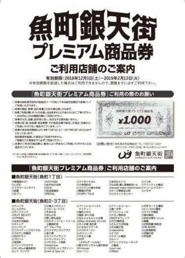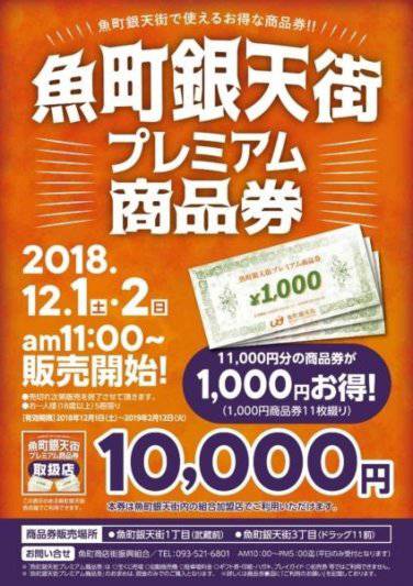 「魚町銀天街プレミアム商品券」販売! 2018.11.16 プレミアム商品券販売 12月1日(土)・2日(日)午前11時から、魚町銀天街で使える、プレミアム商品券を1冊1万円で販売します。 1冊で1万1,000円分使えるお得な商品券。 対象は、18歳以上で、1人5冊まで購入可能です。 売れ切れ次第終了します。
