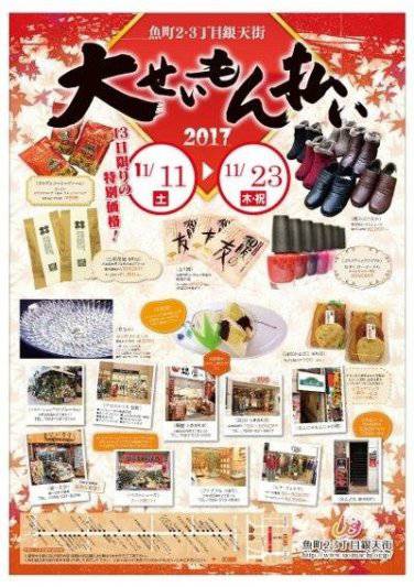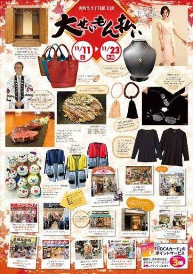 「大せいもん払いセール」開催! 2017.11.11 魚町2・3丁目銀天街 大せいもん払い2017 13日間限りの特別価格! 魚町2・3丁目銀天街では、11月11日(土)~11月23日(木・祝)に『大せいもん払いセール』を開催します。 同時にUOCA来街ポイント3倍セールも実施。