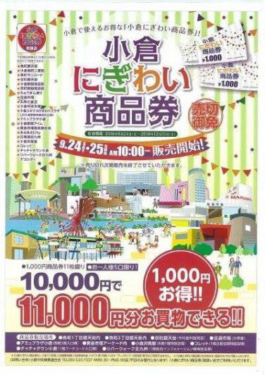 「小倉にぎわい商品券」販売!! 2016.09.11 小倉で使えるお得な「小倉にぎわい商品券」を販売します。 日時 2016年9月24日(土)・25日(日)10:00~ 会場 魚町一丁目銀天街内、魚町三丁目銀天街内他 1,000円商品券11枚綴り、11,000円分を10,000円で販売! お一人様5口限り 売り切れ次第販売を終了させていただきます。 お問い合わせ先:小倉中央商業連合会 093−533−7337 9:30~17:00 (平日のみ受付となります)