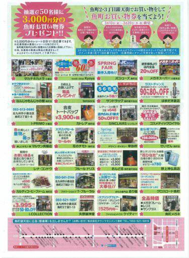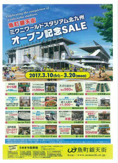 ミクニワールドスタジアム北九州オープン記念SALE 2017.03.09 魚町2・3丁目銀天街でお買い物をして魚町お買い物券を当てよう! 3月10日(金)~3月20日(月・祝)締切 抽選で50名様に3,000円分の魚町お買い物券プレゼント!! 3,000円分のレシート合計で1回応募できます。 応募用紙の裏面にレシートを貼り付けて、魚町銀天街内2ヵ所に設置された応募箱に投函して下さい。 尚、当選者の発表は商品の発送をもってかえさせていただきます、ご了承下さい。 3月12日(日)に北九州スタジアムで行われるギラヴァンツの試合チケットでも1回分の応募が可能です。