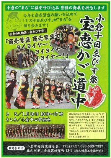 小倉十日ゑびす祭 2016 2015.12.26 小倉の“まち”に福を呼び込み 皆様の発展を記念します。 「商売繁盛 商売繁盛で ヨイヨイヤー! ヨイヨイヤー! ヨイヨイヤー!」 と き 2016年1月10日(日)10:00~17:00 ところ 小倉中心市街地 昭和23年から60年余り続いている。“まち”に福を呼び込む縁起練り歩きです。 芸者姿の「ミス十日ゑびす」と“まち”の世話役が商店街やデパートなど小倉の“まち”を練り歩きます。 「商売繁盛、ヨイヨイヤー!」と掛け声の「小倉ゑびす締め」で打ち込み、小倉の“まち”とお店の発展を祈念します。 どうぞ、お見逃しなく!!