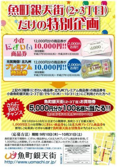 魚町銀天街(2・3丁目)だけの特別企画 2015.09.09 魚町銀天街(2・3丁目)だけの特別企画 小倉にぎわい商品券 北九州プレミアム商品券 上記の2種類(小倉にぎわい商品券・北九州プレミアム商品券)の商品券を小倉魚町銀天街(二・三丁目)で9月10日(木)~10月31日(土)にご利用された方へ!! 魚町銀天街(二・三丁目)のお買物券 5,000円分が100名に当る!!