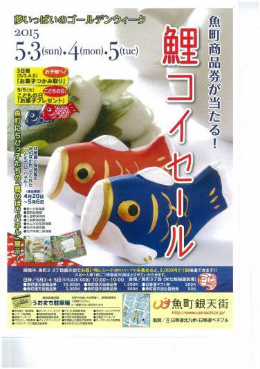 「鯉コイセール2015」開催中! 2015.05.03 「鯉コイセール2015」開催中! 期間中、魚町2・3丁目銀天街でお買い物レシート(鯉のスタンプ付き)を集めると、3,000円で1回抽選できます!! ※お一人様1回につき最高30回迄とさせていただきます。 日時 5月3・4・5日 10:00~19:00 (5/5は20:00迄) 会場 魚町3丁目(米七前抽選会場) 魚町銀天街商品券 10,000円 魚町銀天街商品券 3,000円 魚町銀天街商品券 1,000円 魚町銀天街商品券 500円 日専連ギフト券 500円 魚町銀天街お買物券 50円