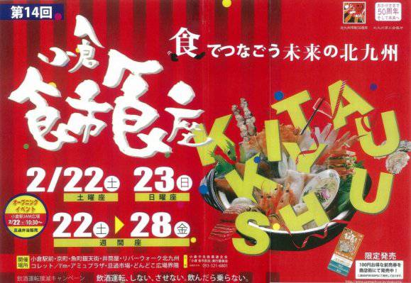 平成26年2月22日(土曜日)~2月28日(金曜日)に「小倉駅前・京町・魚町銀天街・井筒屋・リバーウォーク北九州・コレット/I’m・アミュプラザ・旦過市場・どんどこ広場界隈」で「第14回小倉食市食座」が開催されます。