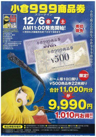 「小倉999商品券」発売! 2013.11.23 「小倉999商品券」発売! 日時 平成25年12月6日(金)・7日(土)11:00~ ※売り切れ次第販売を終了させて頂きます。 お一人様10口限り 500円商品券22枚綴り(合計11,000円分)が9,990円で発売します。 商品券販売場所 小倉魚町銀天街一丁目(武蔵前)、小倉魚町銀天街三丁目(新米谷前)他 取扱店 魚町銀天街他
