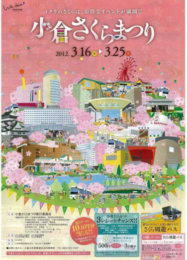 小倉さくらまつり 2012.03.15 小倉さくらまつり 日時 平成24年3月16日(金)~25日(日) 期間中、井筒屋クロスロードで北東北物産展やスイーツフェスティバルが催されるほか、小倉各所の商店街や大型ショッピング店舗で様々なイベントが行われます 魚町銀天街でのイベント 魚町銀天街ワゴンセール お買い得商品、お得な商品がいっぱい! UOCA来街ポイント10倍セール! 魚町銀天街の来街ポイント機が10倍! 小倉さくらまつり3レシートチャンス さくらまつり参加店舗のレシートを3枚集めると豪華賞品が当たるチャンス! 期間中、にしてつの臨時バス「さくら周遊バス」を走らせます、ぜひご利用ください