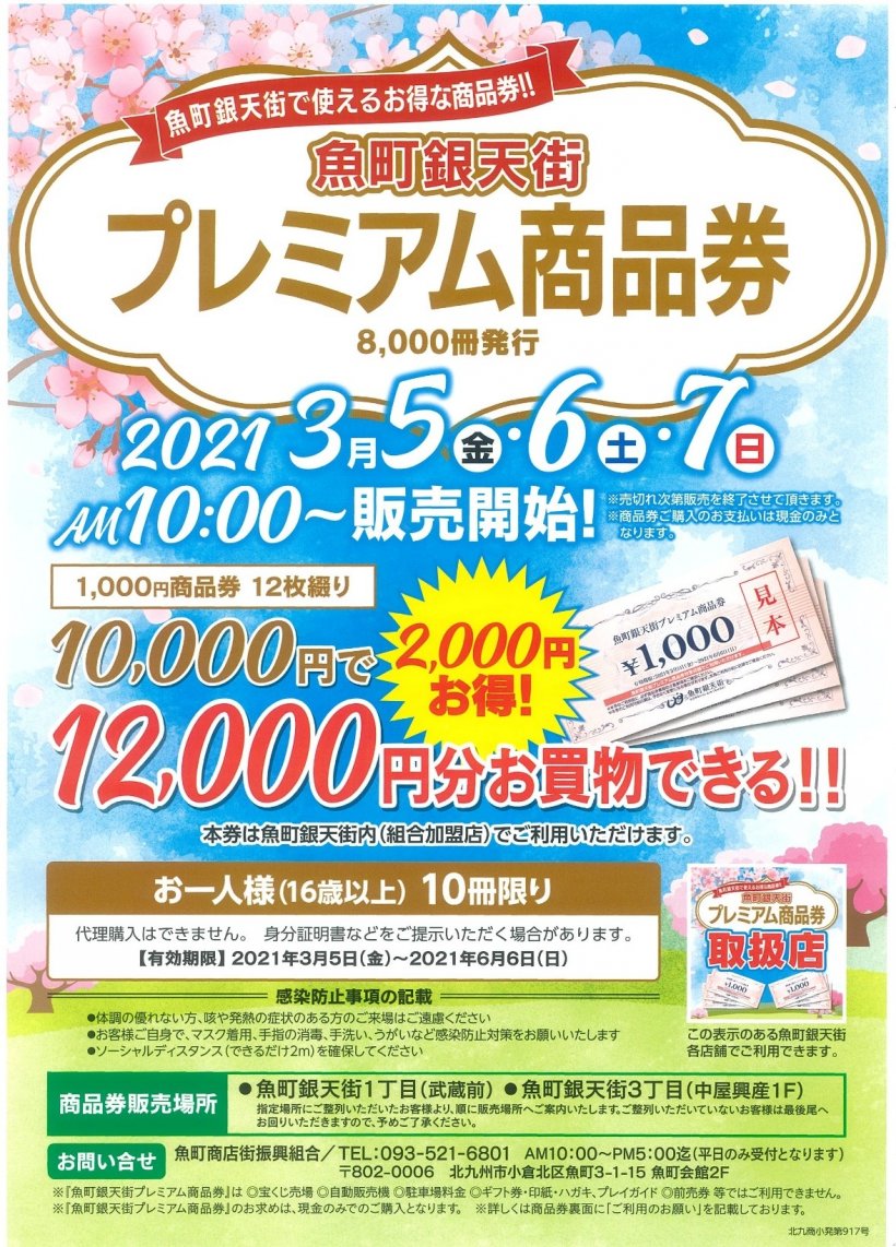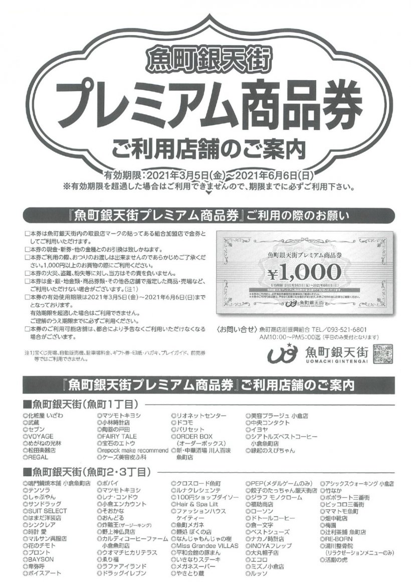 「魚町銀天街プレミアム商品券」販売! 2021.01.28 魚町銀天街プレミアム商品券 8000冊発行(井筒屋その他の商業施設では使えません。) 日時:2021年3月5日(金)、6日(土)、7日(日)10:00~ 売り切れ次第その日の販売を中止します。現金のみでしかお売りできません。 会場:魚町一丁目武蔵前、魚町三丁目中屋ビル 10,000円で12,000円分のお買い物が出来ます! お一人様(16歳以上)、10冊限りです 代理購入は出来ません。身分証明書提示を求めることもございます。 有効期限:2021年6月6日(日)まで プレミアム商品券ご利用店舗のご案内