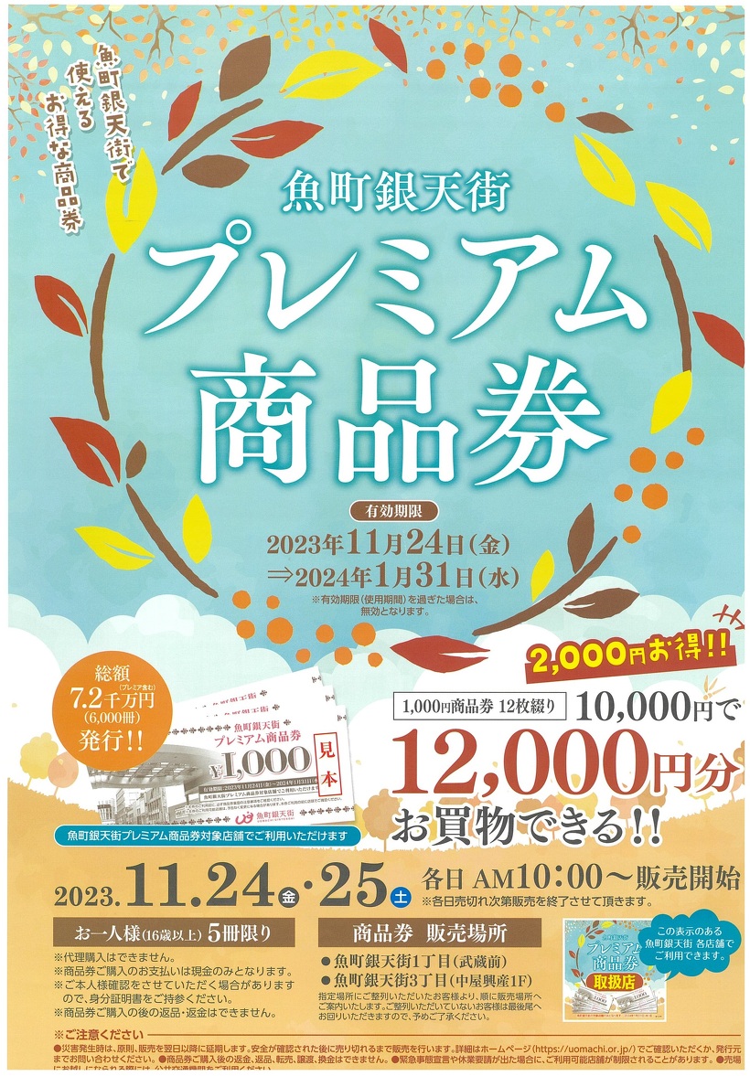 2023年「魚町銀天街プレミアム商品券」販売! 2023.10.17 販売日:2023年11月24日(金)~11月25日(土)10:00~ 販売会場:魚町一丁目「武蔵前」、魚町三丁目「中屋ビル1階」 有効期限:2023年11月24日(金)~2024年1月31日(水) お一人様(16歳以上)5冊限り