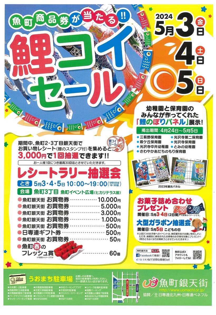 魚町でお買い物の鯉のスタンプを押したレシート3,000円分で1回ガラポンにチャレンジ!