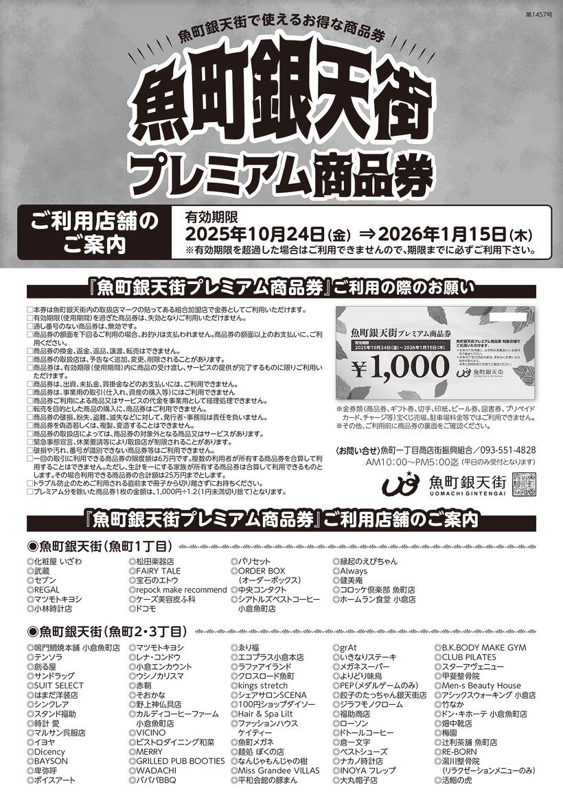 「魚町銀天街プレミアム商品券」販売! 2025.10.02 日時:2025年10月24日(金)25日(土)10:00〜 会場:魚町銀天街一丁目(武蔵前) 魚町銀天街二丁目(INOYA横) プレミア率:20%(12,000円の商品券を10,000円で販売) ※お一人様(16歳以上)5冊限り) ※代理購入」はできません ※現金のみの販売です ※ご本人様の確認が必要な場合あります ※商品券の返品・転売・転売・課金・譲渡できません ※商品券ご利用上の注意 1回の取引に利用できる商品券の限度額は6万円です。 複数の利用者が商品券を合算して利用することはできません。 生計を一にする家族が商品券を合算して利用する場合、限度額は25万円です。