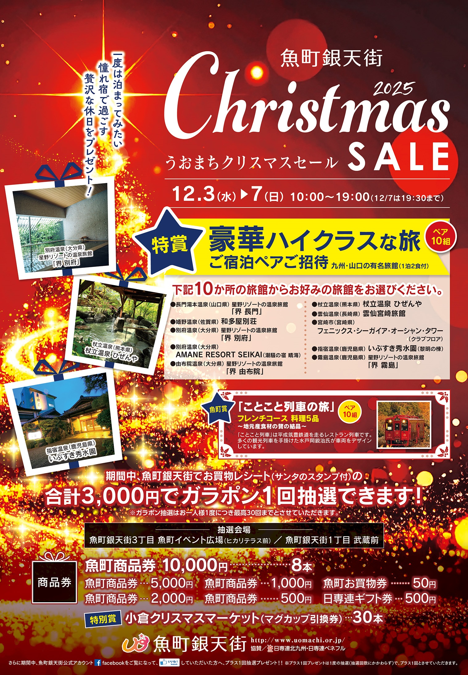 「魚町銀天街クリスマスセール」開催! 2025.11.12 日時:2025月12月3日(水)~12月7日(日)10:00~19:00 12月7日(日)は、19:30まで 会場:魚町三丁目銀天街 魚町イベント広場 魚町一丁目銀天街 武蔵前 期間中、魚町銀天街でお買物レシート(サンタのスタンプ付)の 合計3,000円でガラポン1回抽選できます! ※ガラポン抽選は、お一人様1度につき最高30回までとさせていただきます。 特 賞:豪華ハイクラスな旅 ペア10組 魚町賞:ことこと列車の旅 ペア10組 魚町商品券:10,000円×8本 その他 特別賞:小倉クリスマスマーケット(マグカップ引換券)×10本