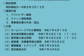 参加表明書提出期限:令和7年4月21日まで 契約期間:令和7年3月14日まで 業務内容:アドバイザー業務、テナント誘致業務、事業報告書の作成・提出