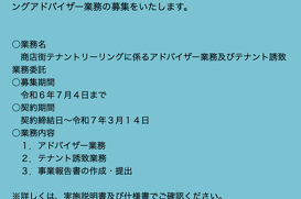 募集期間:令和6年7月4日まで 契約期間:令和7年3月14日まで 業務内容:アドバイザー業務、テナント誘致業務、事業報告書の作成・提出